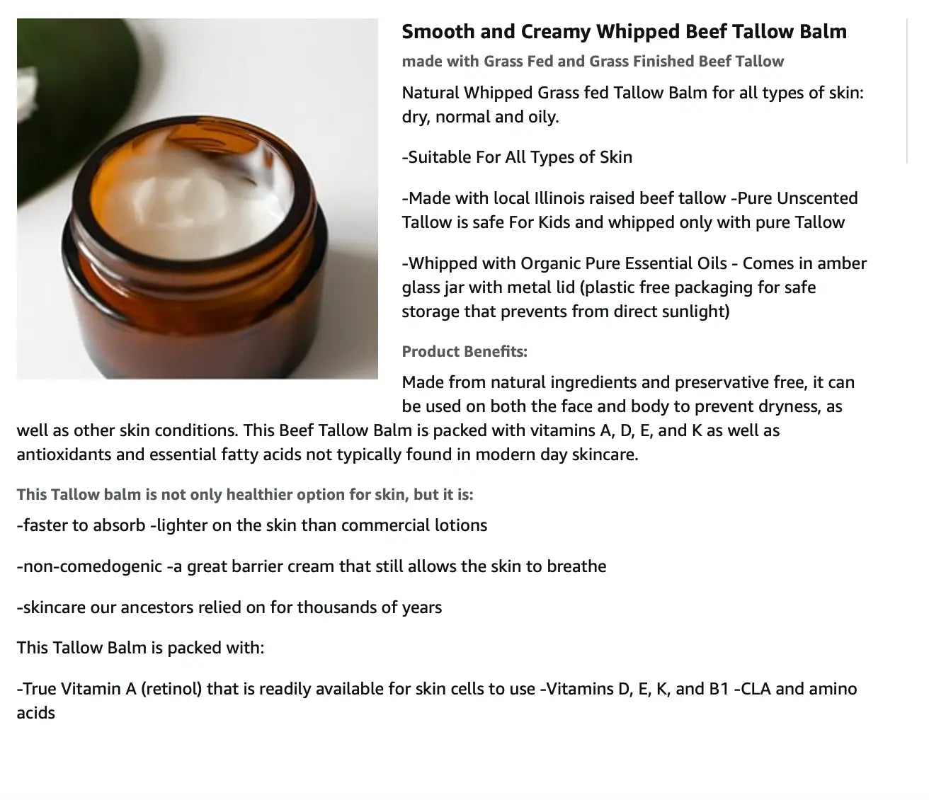 Natural Whipped Grassfed Tallow Balm for Dry Skin